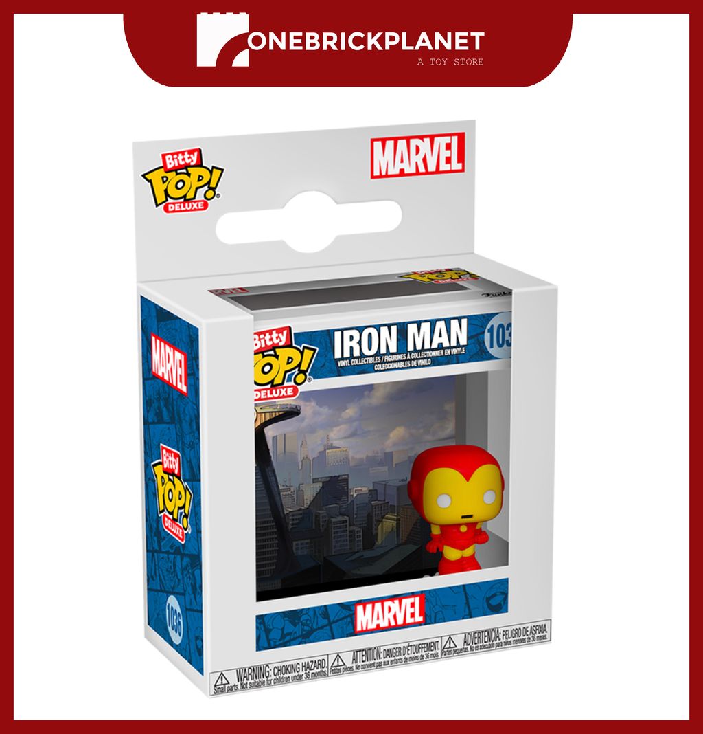 Expand your Marvel collection with this Deluxe Bitty Pop! figure featuring Iron Man set before a backdrop of Avenger's Tower!