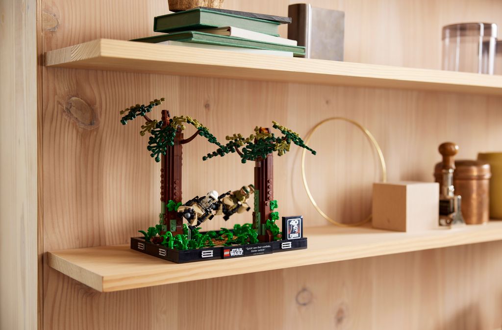 Capture the dynamism of a thrilling Star Wars: Return of the Jedi scene with the LEGO Star Wars Endor Speeder Chase Diorama (75353). It features 3 LEGO minifigures (Princess Leia, Luke Skywalker and a Scout Trooper), 2 speeder bikes with transparent elements so you can pose them at angles as if flying through the forests of Endor, 2 buildable trees and new-for-May-2023 fern elements. Complete this build-and-display model with a plaque featuring Luke Skywalker’s words (“Quick! Jam their comlinks. Center switch!”) and a plaque with the Star Wars: Return of the Jedi 40th anniversary logo.